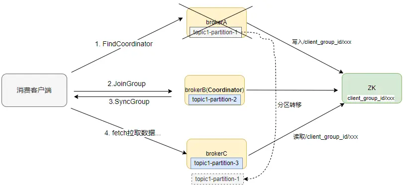 \_id/xxx,同時請求返回brokerB作為Coordinator,後續與brokerB進行joinGroup、syncGroup等交互確定消費關係,客户端在brokerA、brokerB、brokerC都有分區消費。這時重啓brokerA,分區均衡到BrokerC上,但此時/client\_group_id/xxx因關閉broker而斷開連接被刪除,consumer消費剛轉移到topic1-partition-1的分區就無法獲取到groupId。