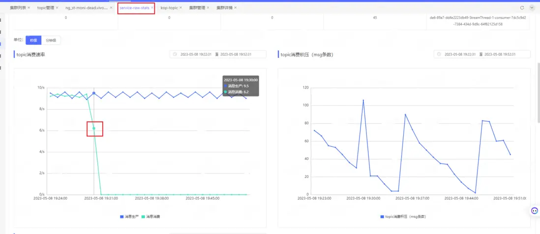 在一次版本灰度升級中,我們發現某個使用KoP的業務topic的消費速率出現了顯著下降,具體情況如下圖所示: