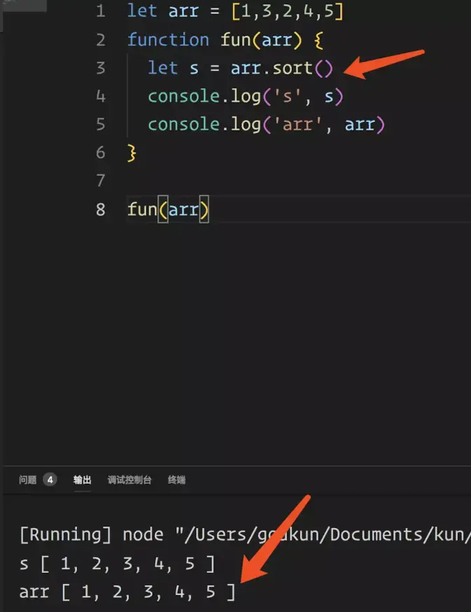 看上面,你會發現數組 arr 被修改了。由於 fun(arr) 函數中的參數 arr 是引用類型,如果函數體內對此引用所指的數據進行直接操作的話,就會有潛在的副作用,比如原數組被修改了,這種情況下,該怎麼辦呢?