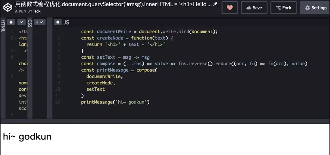 關鍵註釋,我已經在代碼中標註了。上面代碼在第一次進行函數式優化的時候,在組合和高階的基礎上,加入了柯里化,從而讓函數變得更有複用性。