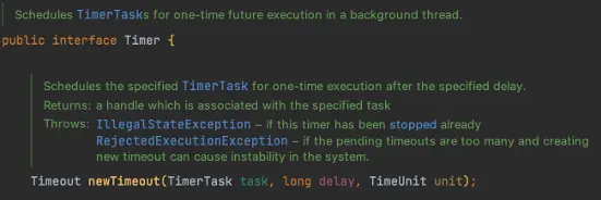首先是 Timer 接口,這個一個調度的核心接口,主要用於後台的一次性調度,我們僅介紹 newTimeOut 方法,這個方法就是把一個任務扔給調度器執行,第一個參數類型 TimerTask,即需要執行的任務。