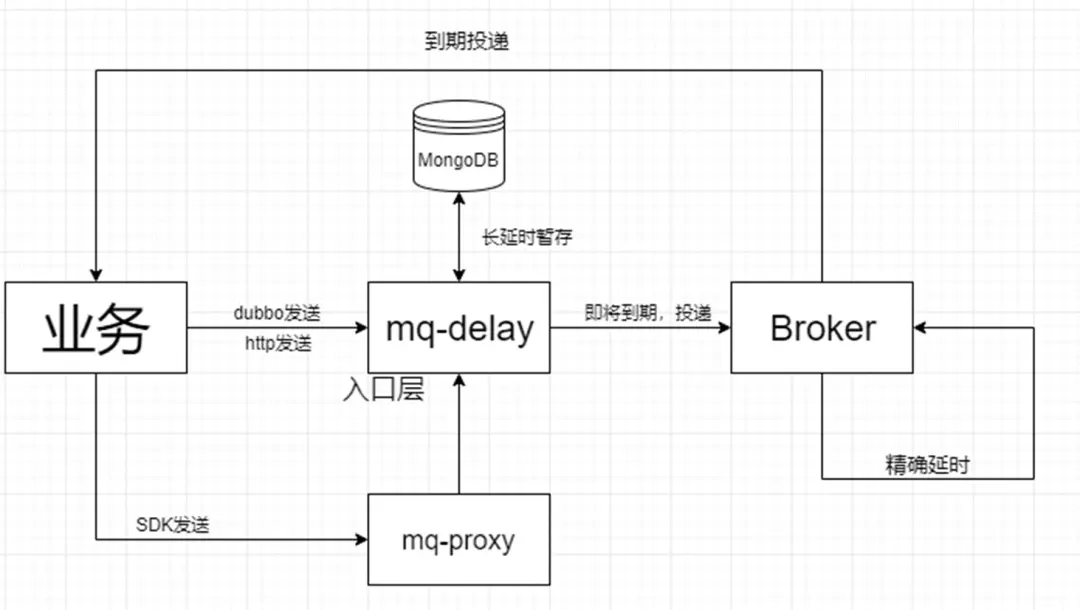 我們更期望有成熟的框架,能夠提供 1.長延遲任務的持久化 以及 2. 任務調度 的能力。從中間件平台組提供的 MQ 中,我們發現目前它是已經支持 包含這兩個能力的延遲 MQ 功能的。延遲 MQ 架構大致如下圖所示:
