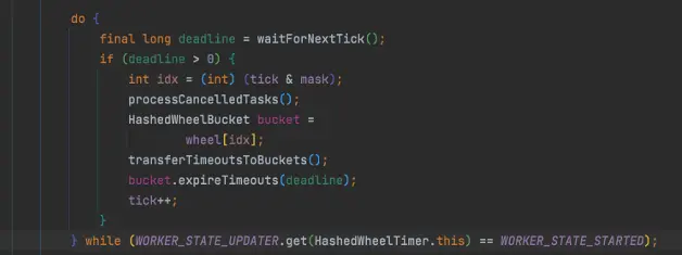 首先是 HashedWheelTimer 的內部類 Worker,其中 run 方法的主體流程如下: