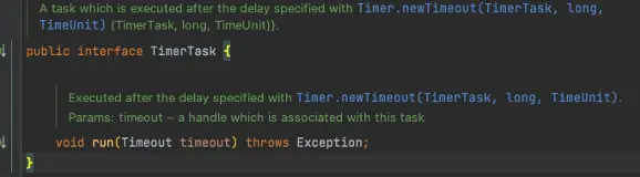 接下來是 TimeTask 接口,它只有一個方法 run,參數類型是 Timeout,我們注意到上面 Timer 接口的 newTimeout 這個方法返回的參數就是 Timeout,和此處的入參相同,實際這裏傳入的 Timeout 參數就是 newTimeout 的返回值。