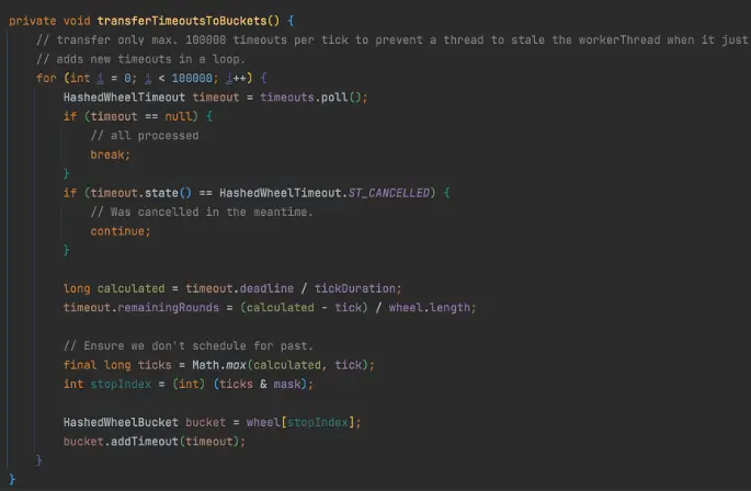 我們重點關注下定時器啓動狀態下的第 3 步,獲取當前時間槽,並將待處理任務隊列中的任務放到槽中的方法 transferTimeoutsToBuckets,其流程為以下幾個步驟(這裏規定循環了有限次,防止待處理隊列過大,導致本次添加到槽耗費時間過長):