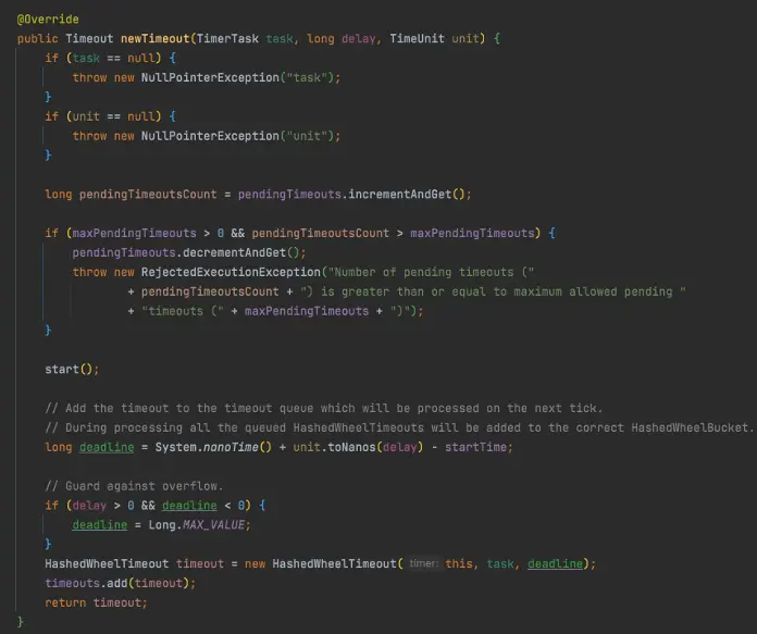下面介紹下 newTimeout 方法,這個方法的主要作用是向調度器中添加一個待執行的任務,同樣忽略基本的參數校驗,主體流程為: