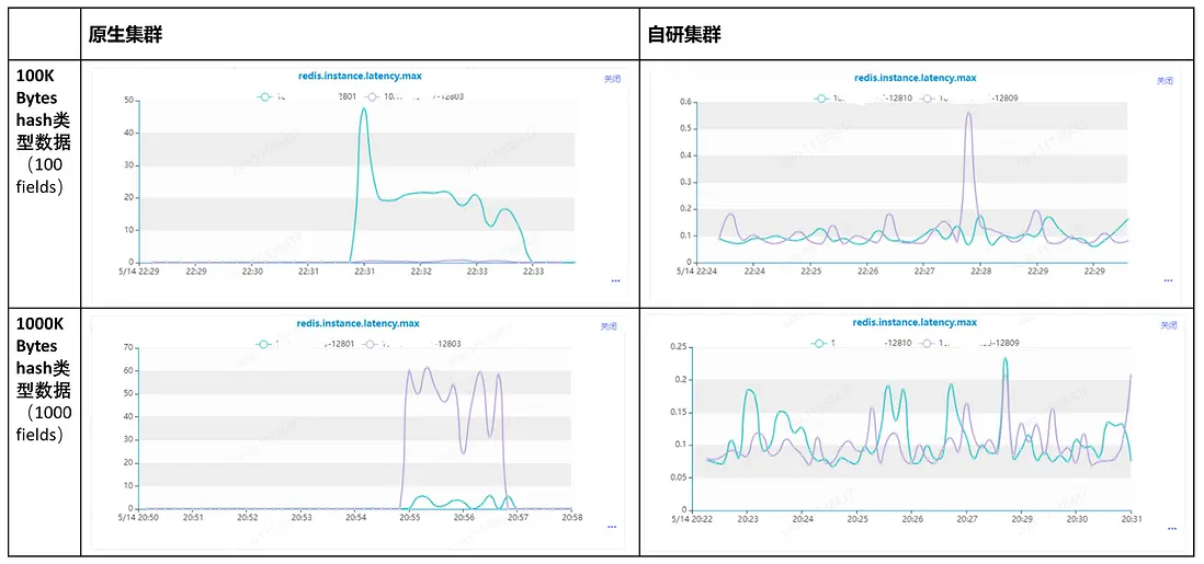 為了驗證改造後遷移功能的效果,對比自研遷移和原生遷移對請求響應的影響,在三台同樣配置物理機上部署了原生和自研兩套相同拓撲的集羣,選擇後對 hash 數據類型的 100k 和 1MB 兩種大小數據分別進行了遷移測試,每輪在節點間遷移內存用量 5G 左右的數據。測試主要目的是對比改造前後數轉移對節點服務時延影響,所以在實際測試時沒有對集羣節點進行背景流量操作,節點的時延數據採用每秒鐘 ping 10 次節點的方式進行採集,遷移期間源節點和目的節點的時延監控數據入下表所示(縱軸數值單位:ms)。