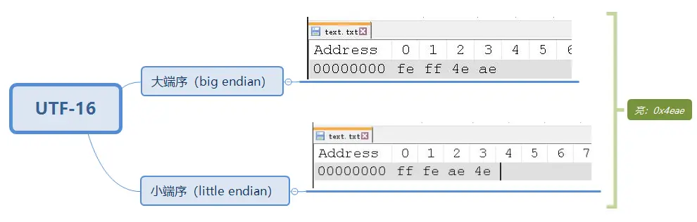 UTF - 16 編碼的時候,除本身的字節,為了區分大端序和小端序,最開頭還多了兩個字節,ff和fe。feff代表大端序,fffe代表小端序。