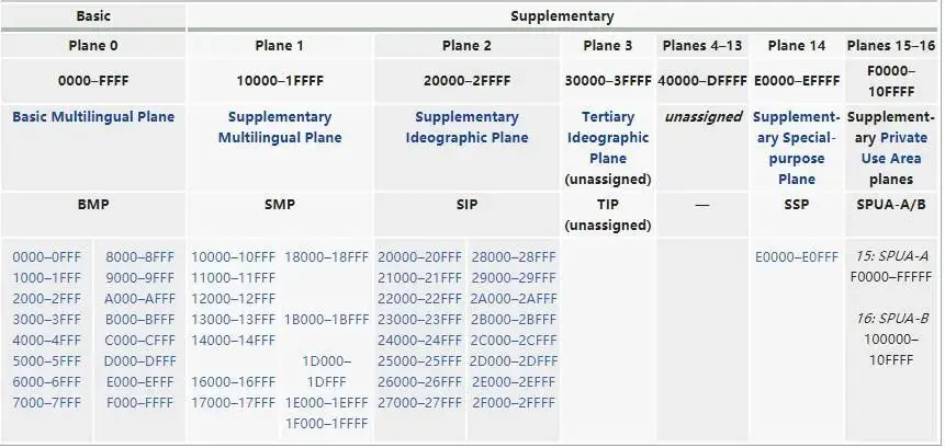 用 0x000000 - 0x10FFFF 這麼多的數字去對應全世界所有的語言、公式、符號。然後把這些數字分成 17 部分,把常用的放到 0x0000 - 0xFFFF,也就是 2 個字節,叫做基本平面 (BMP);從 0x010000 - 0x10FFFF 再劃分為其他平面。