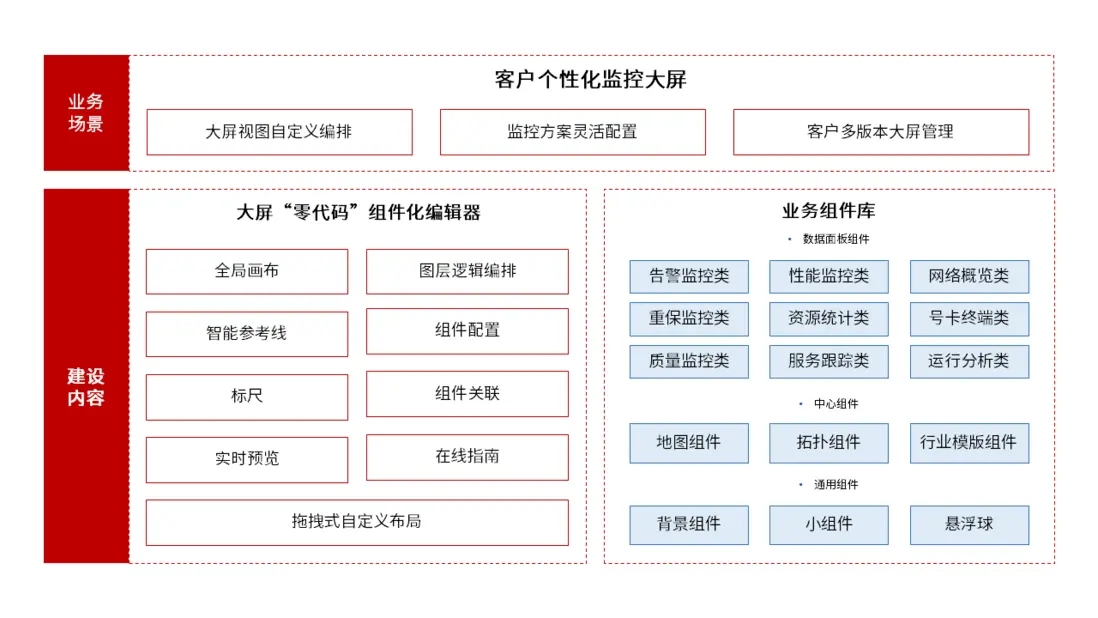 在通信領域中,不同客户的數字化場景存在多種個性化大屏的定製需求,常見業務範圍涵蓋政務、金融、教育、工業、傳媒、互聯網等行業領域。然而,面對如此巨大的產業痛點訴求,傳統低代碼領域卻存在數據監控粒度不統一、定製化研發成本高、版本維護難度大等問題,嚴重影響了客户的交付效率及使用感知。