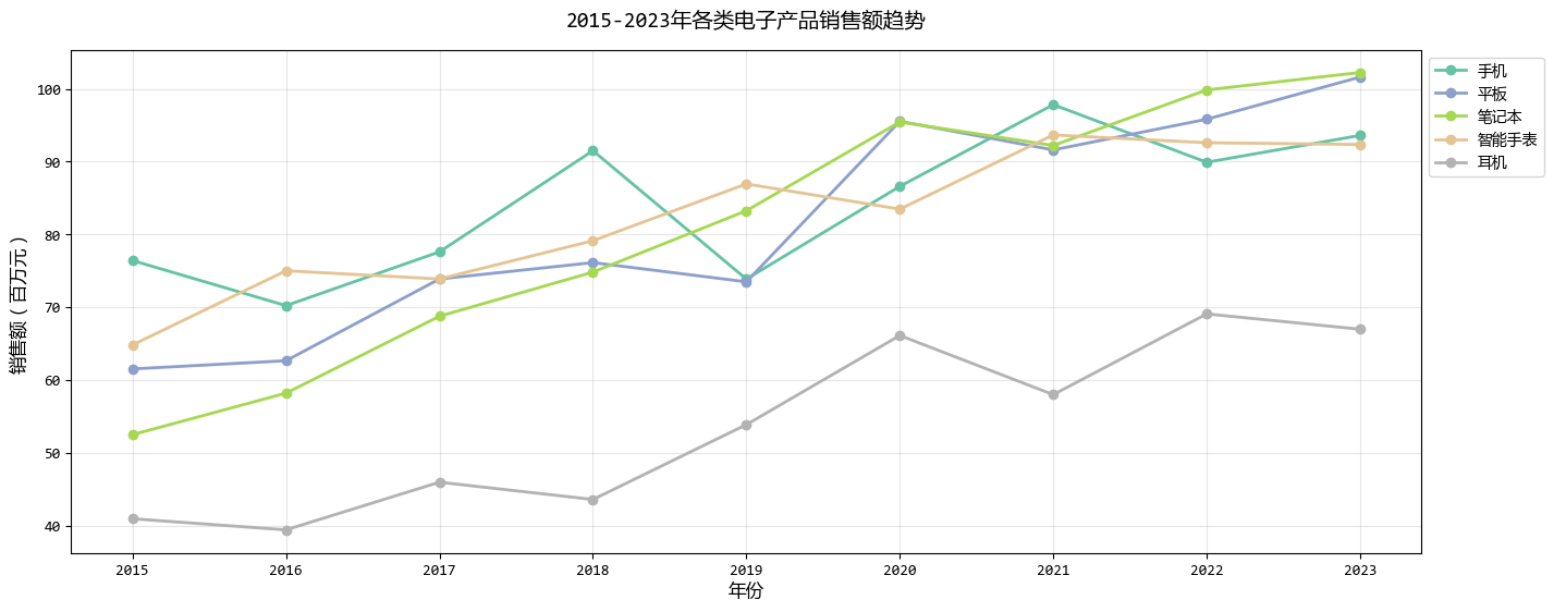 ax1.plot(years, sales, color=colors[idx], linewidth=2, marker='o', label=product)