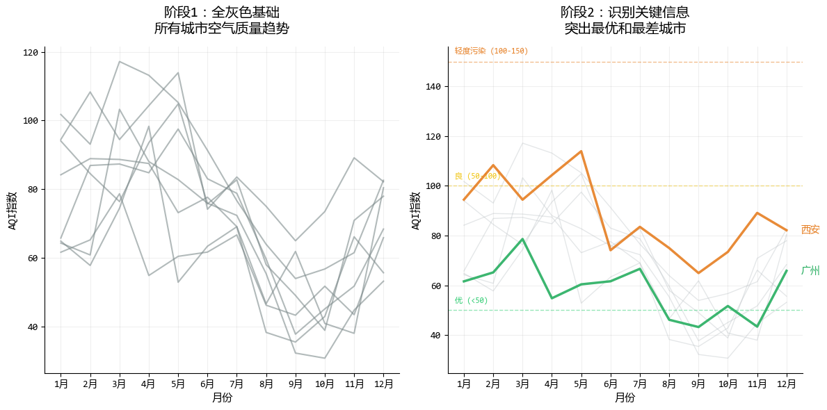 ax1.plot(months, aqi_data[city], color="#7F8C8D", linewidth=1.5, alpha=0.6) # 灰色