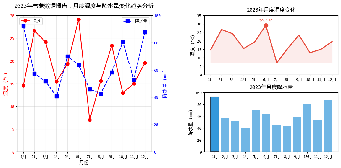 ax1.plot(months, temperature, "ro-", linewidth=2, markersize=8, label="温度")