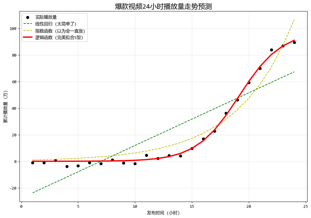 - 黃線(指數):在視頻爆發初期(前10小時)擬合得很好,但它會預測24小時後播放量破億,這顯然不符合實際(因為受眾是有限的)。