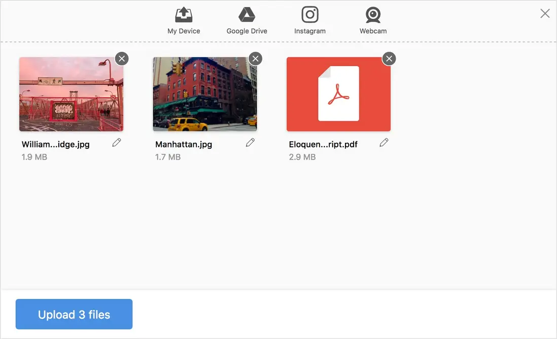 - 從本地磁盤,Google雲端硬盤,Dropbox,Instagram獲取文件,或使用相機捕捉和記錄自拍;