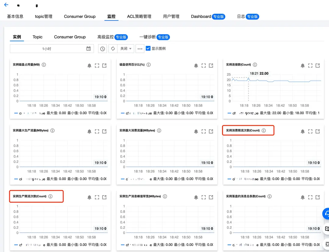 在 CKafka 控制枱的監控頁面查看實例監控,當限流次數大於 0,證明發生過限流。
