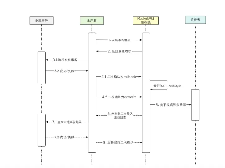 - 生產者收到請求後提交二次確認結果,邏輯再次回到第5步,此時如果生產者服務暫時不可用,則 RocketMQ 服務端會在指定時間間隔後,繼續主動發起回查請求,直到超過最大回查次數後,回滾消息。