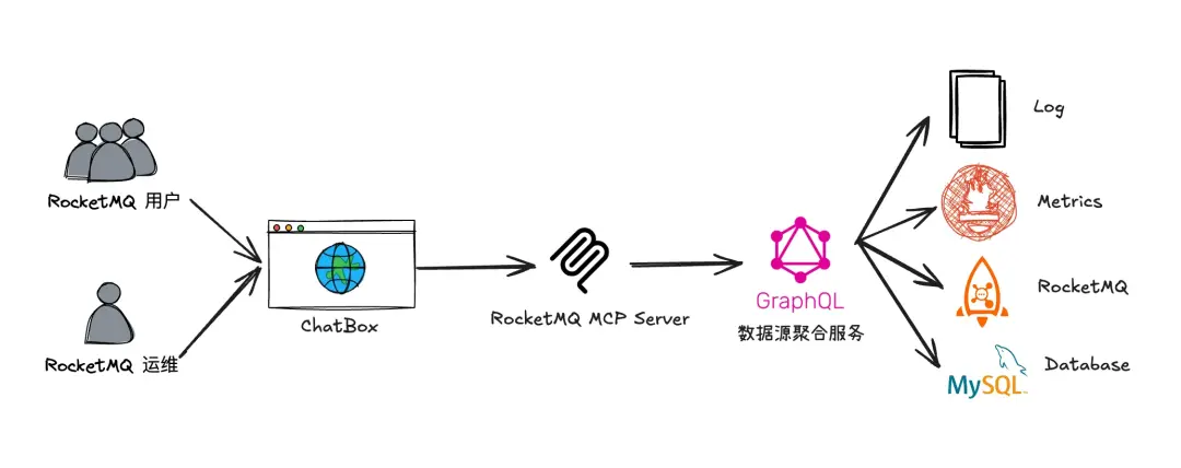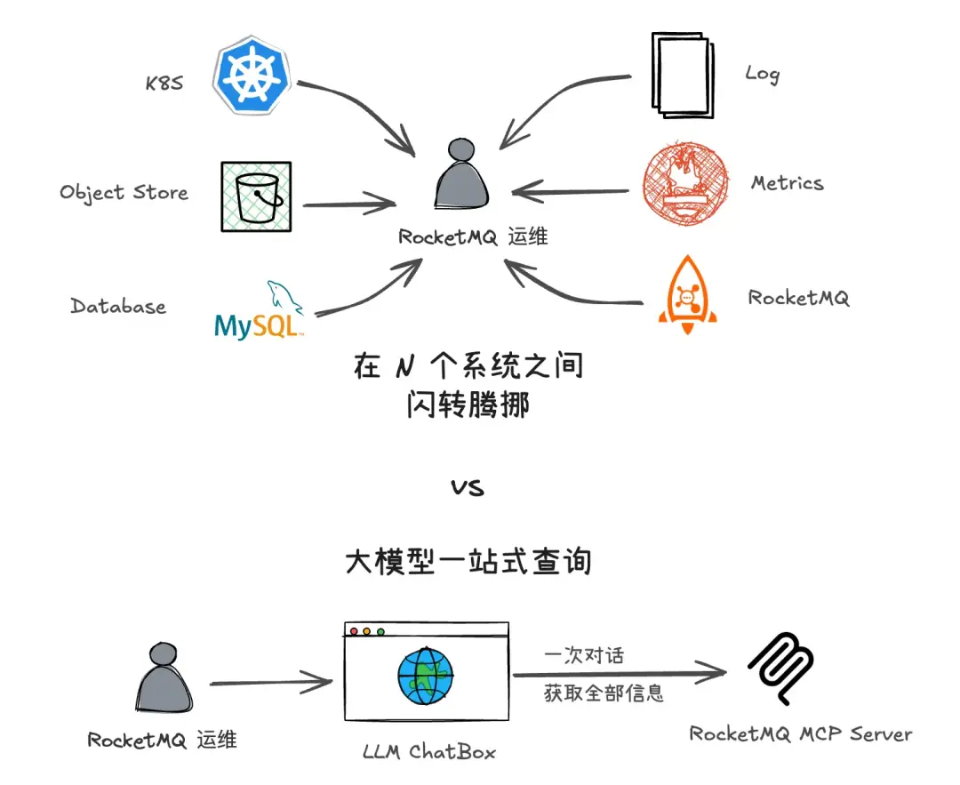 在 RocketMQ 的日常運維中,我們經常需要訪問不同的數據源來獲取診斷信息。傳統的方式往往需要編寫複雜的查詢語句,或者在多個系統之間切換,效率低下。為了解決這個問題,我們使用 LLM 結合 MCP 來實現高效的數據訪問。通過這種方式,可以用自然語言一站式查詢所需的信息,提高運維效率。