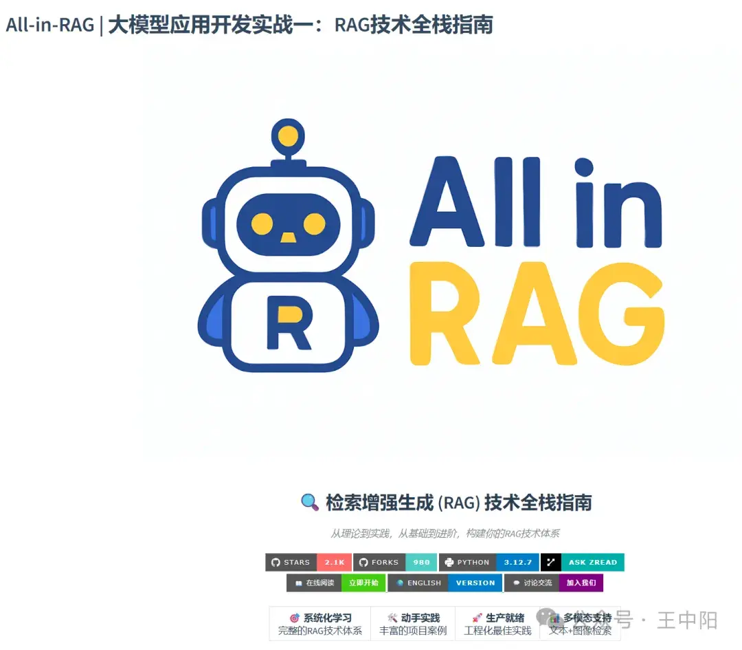 這是我們各種調研對比實操之後,覺得最好的RAG教程,沒有之一:https://datawhalechina.github.io/all-in-rag/#/
