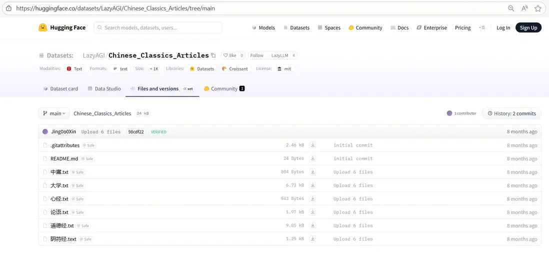 (示例數據集下載鏈接:https://huggingface.co/datasets/LazyAGI/Chinese\_Classics\_Articles/tree/main)