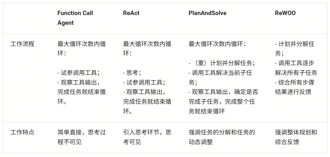 AI Agent 有很多類型的工作流程,這裏介紹幾種常見的工作流程:Function Call Agent、ReAct、PlanAndSolve 以及 ReWOO。AI 智能體的工作流程主要就是其行為模式,就像是一個人做事的行為習慣: