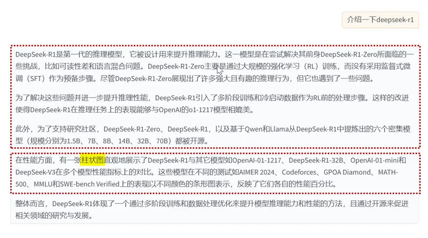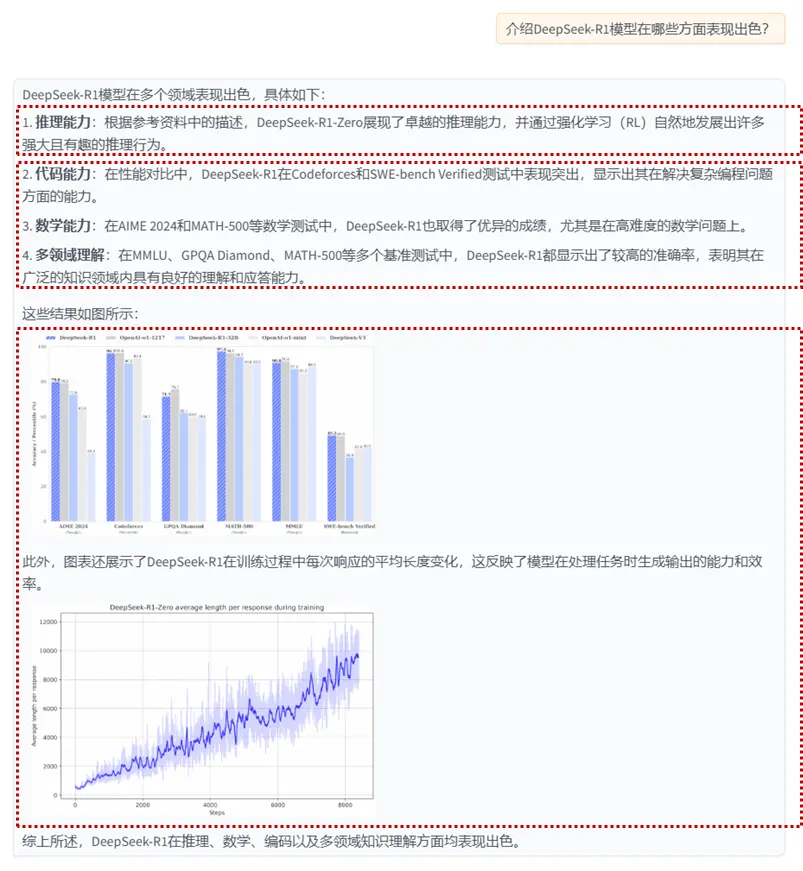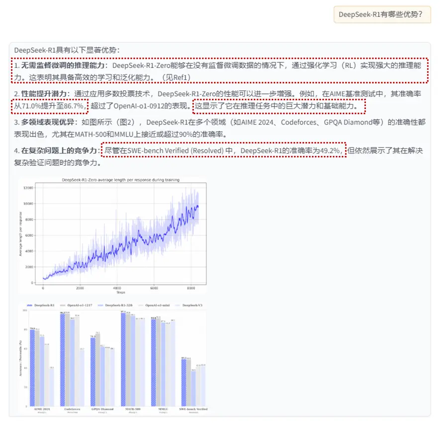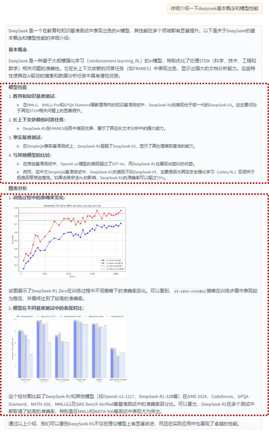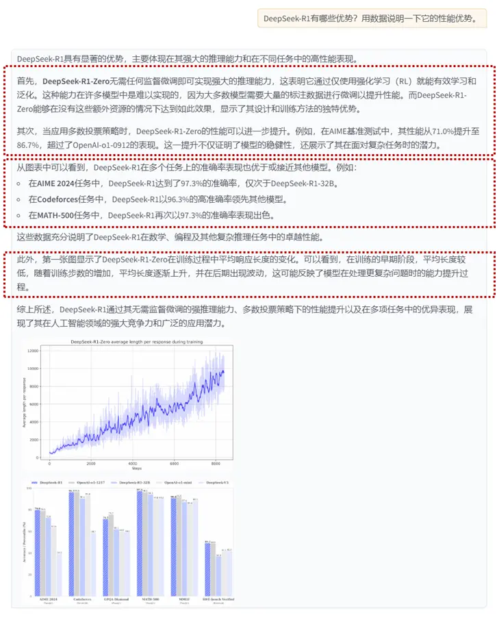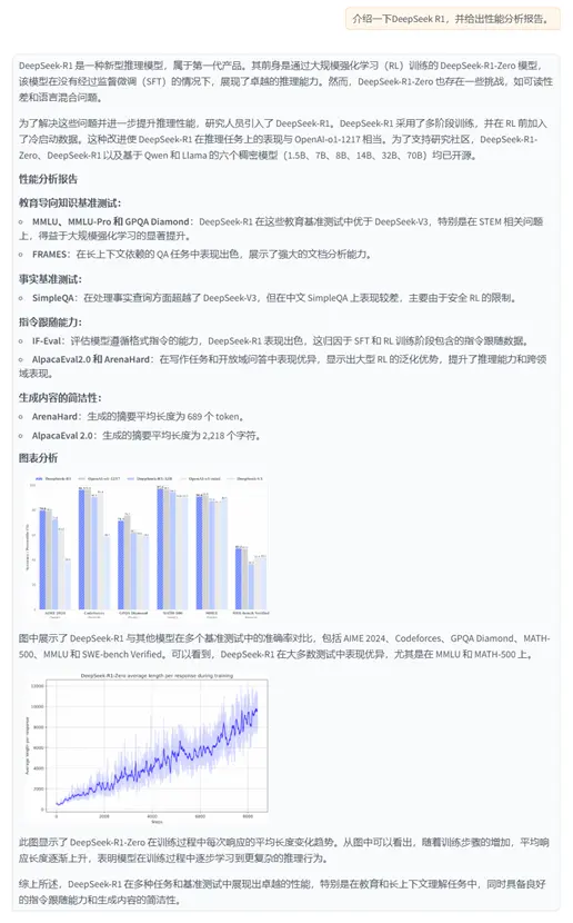 內容1:DeepSeek-R1 outperforms DeepSeek-V3 on education benchmarks and long-context QA, excelling in STEM and factual queries via reinforcement learning. However, it underperforms on Chinese SimpleQA due to safety RL restrictions.