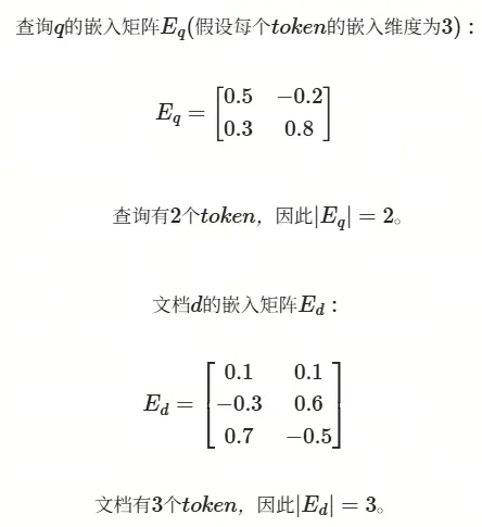 - 對每個查詢 token,計算它與文檔中所有 token 的點積(相似度)。