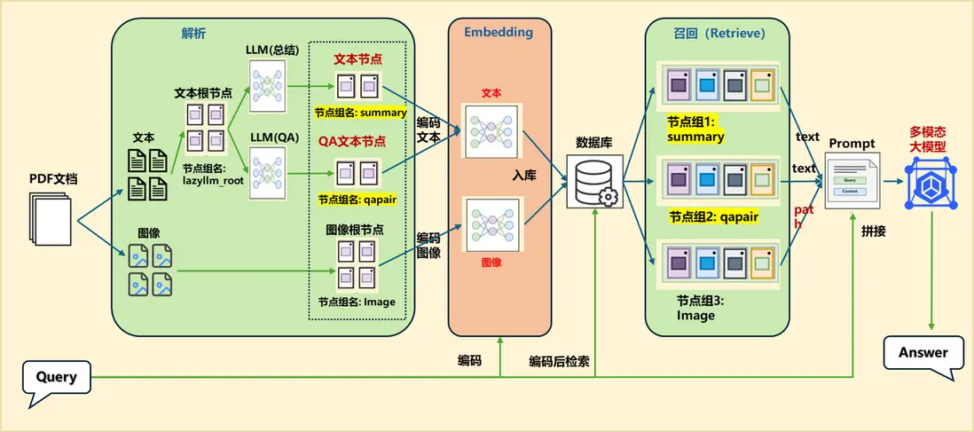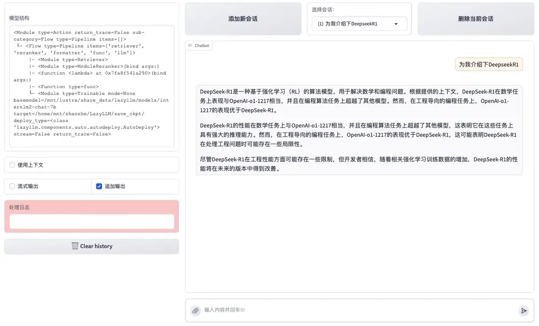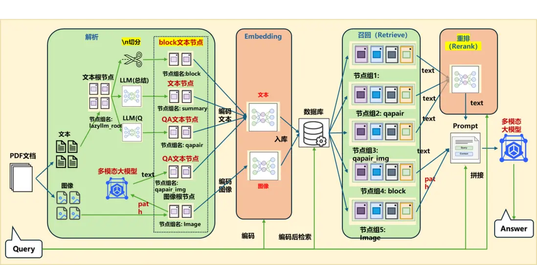- 數據處理與組件搭建:通過LazyLLM框架,我們構建了文檔解析器、檢索器、重排器(Reranker)和大模型(LLM)等核心組件,逐步實現了從文檔解析到問答生成的完整流程。