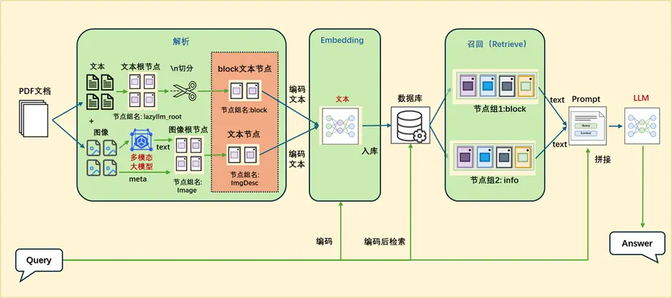 - 自定義PDF解析器:通過mineru工具,我們實現了對PDF文檔的深度解析,能夠提取文本、圖片和表格等結構化信息,並將其存儲為DocNode對象,便於後續的檢索和處理。