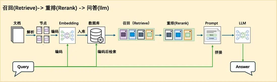 為了使傳給大模型的相關上下文更精準,我們還要對檢索到的這些文本段進行一下精排,即 Rerank。Rerank 可以把多種檢索策略下檢索到的文本段在統一空間中進行比較,然後返回相似度最高 K 個,然後和前面的 query 一起拼接在一個給大模型做最後的結果生成。