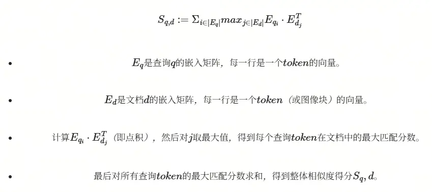 - 將所有查詢 token 的最大相似度相加,得到最終的相似度得分。