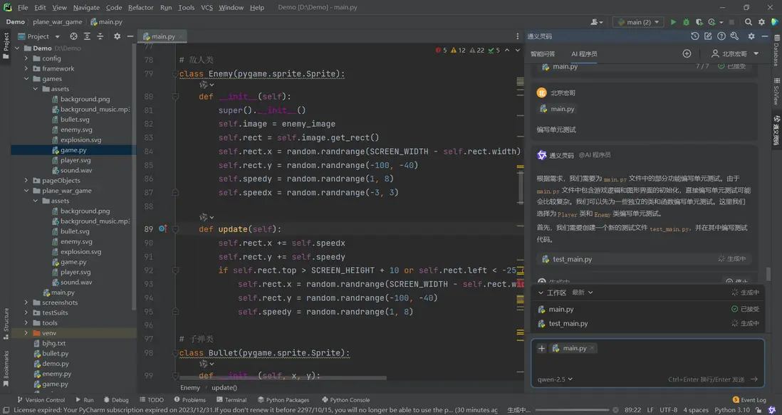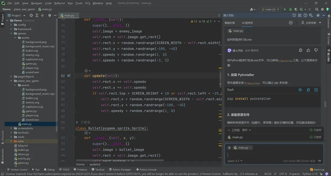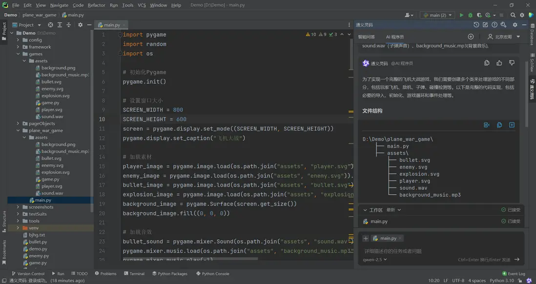 1.實際運行中交互效果問題,直接向AI程序員提問,幫你完善。比如我遇到的問題:”子彈不跟着飛機移動”,給出的修復代碼直接採用即可!如下圖所示: