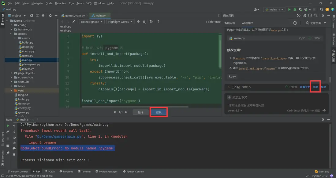 2.從上圖我們可以看到,AI程序員直接定位到有問題代碼的地方,同時給出瞭解決方案 :檢查是否有未安裝的模塊,如何有,則通過命令進行安裝,如果你覺得沒有問題,點擊“接受”就可以了,如下圖所示: