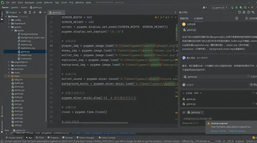 生成飛機大戰遊戲完整代碼,用pygame運行,記得不是簡單的遊戲框架代碼哦,而是完整代碼,利用飛機大戰文件夾中的遊戲素材: bullte.svg(子彈圖), enemy.svg(敵機圖),explosion.svg(爆炸素材圖)、player.svg(我方機圖)、sound.wav(子彈聲音)、background_music.mp3(背景音樂),如下圖所示: