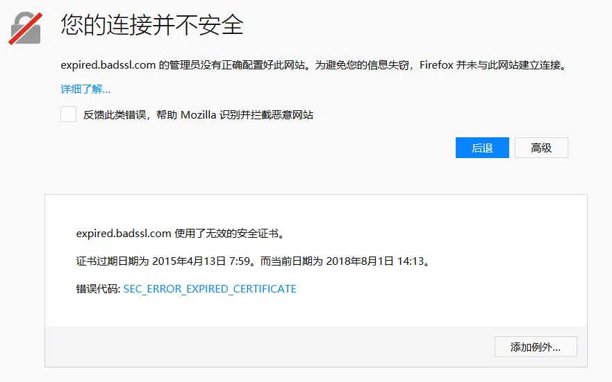 當 Firefox 連接到一個安全的網站時(網址最開始為“https://”),它必須確認該網站出具的證書有效且使用足夠高的加密強度,以充分保護您的隱私。如果證書無法通過驗證,或加密強度過低,Firefox 會中止連接到這個網站,並向您顯示SSL證書錯誤信息頁面:“你的連接不安全”。