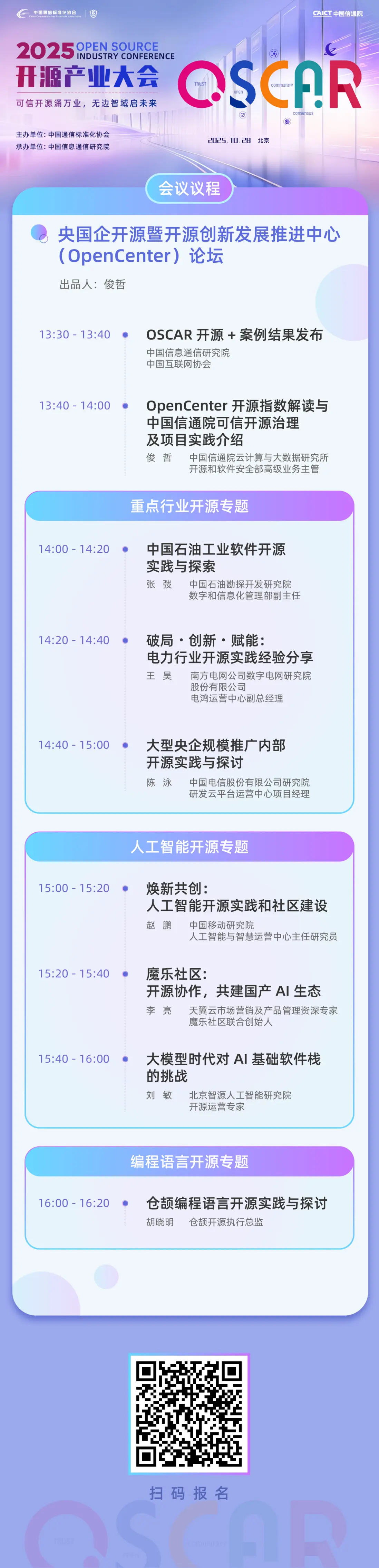 2025 年 10 月 28 日,由中國通信標準化協會主辦、中國信息通信研究院(以下簡稱“中國信通院”)承辦的第九屆 OSCAR 開源產業大會即將重磅啓幕。作為大會核心分論壇之一,“央國企開源暨開源創新發展推進中心(OpenCenter)論壇”議程正式揭曉!論壇邀請了產學研屆的開源治理專家,圍繞在產業變革與企業內在需求的雙重驅動下,央國企如何更好的運用開源技術賦能創新,如何建立科學的開源治理模式展開深度分享,為推動央國企高質量數字化轉型提供路徑指引。