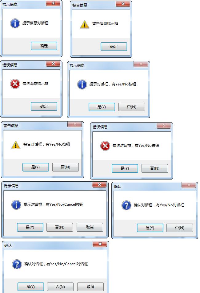 封裝的消息提示對話框包括個各種常用的對話框,如下所示: