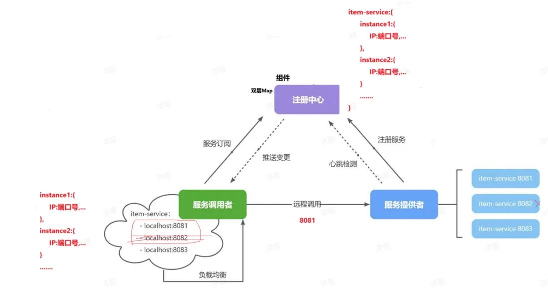 註冊中心:在註冊中心服務端,有一個用來管理服務的容器,他保存着所有服務的實例。(包括服務調用者)(底層結構是雙層map、mysql數據庫等)