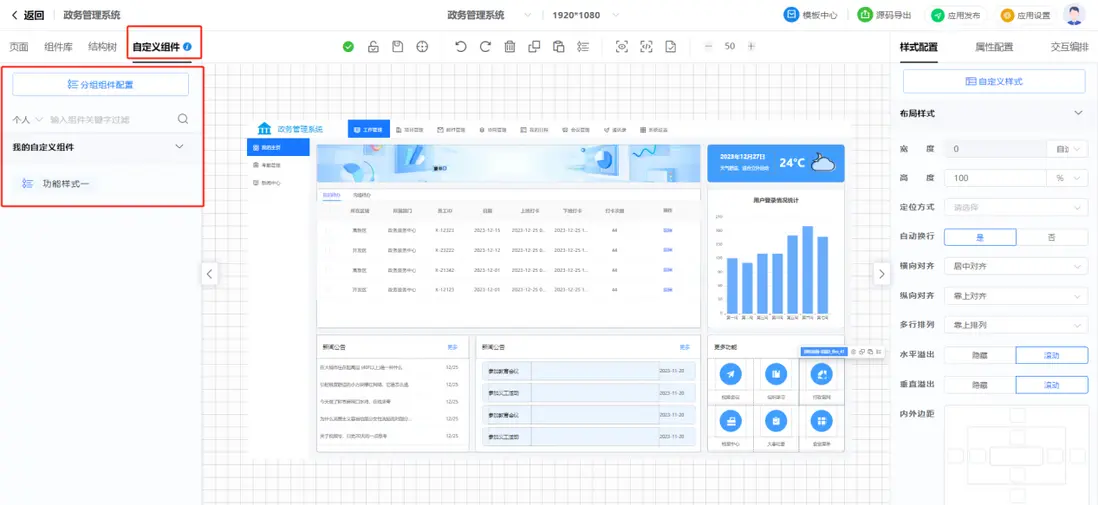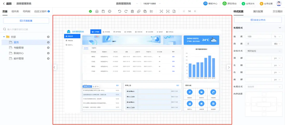 樣式配置就是給選中的組件配置佈局樣式、背景樣式等,佈局樣式中可以設置被選中組件的高度、寬度、頂部、左側、右側、底部等邊距,背景樣式中可以設置背景圖片、顏色、邊框的樣式等。