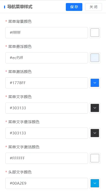 (2)導航菜單樣式配置是配置菜單的背景顏色、選中顏色等樣式,如下圖: