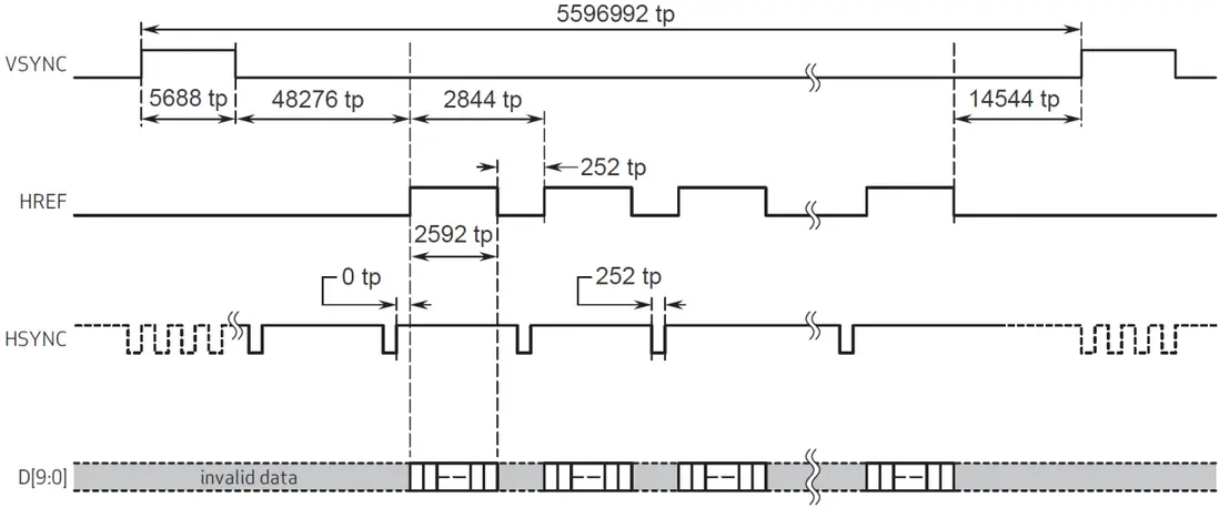 從上圖可以看出,圖像數據在HREF為高的時候輸出,當HREF變高後,每一個PCLK時鐘,輸出一個8位/10位數據。我們採用8位接口,所以每個PCLK輸出1個字節,且在RGB/YUV輸出格式下,每個tp=2個Tpclk,如果是Raw格式,則一個tp=1個Tpclk。比如我們採用QSXGA時序,RGB565格式輸出,每2個字節組成一個像素的顏色(低字節在前,高字節在後),這樣每行輸出總共有25922個PCLK週期,輸出25922個字節。