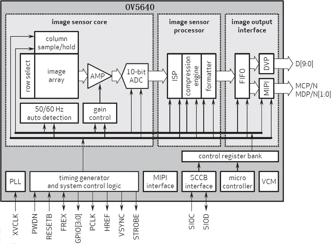 OV5640由內置微型控制器完成自動對焦,並且VCM(Voice CoilMotor,即音圈馬達)驅動器也已集成在傳感器內部。微型控制器的控制固件(firmware)從主機下載。當固件運行後,內置微型控制器從OV5640傳感器讀得自動對焦所需的信息,計算並驅動VCM馬達帶動鏡頭到達正確的對焦位置。主機可以通過IIC命令控制微型控制器的各種功能。