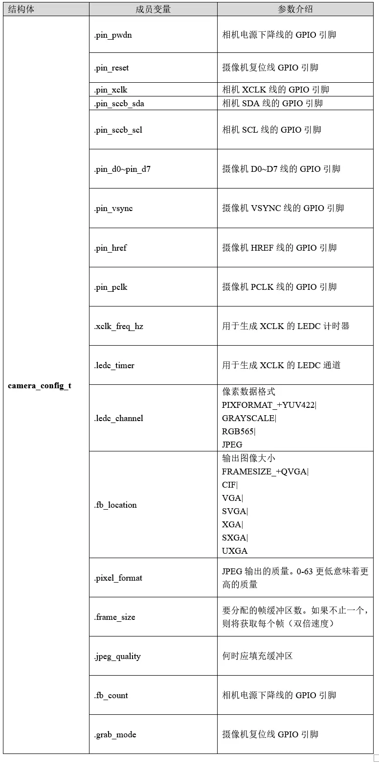 首先定義一個camera_config_t類型的局部結構體變量,然後給結構體中的成員賦值,再調用esp_camera_init(&camera_config)函數進行初始化。如果攝像頭模塊是OV3660或者是OV5640,還需要進行配置。