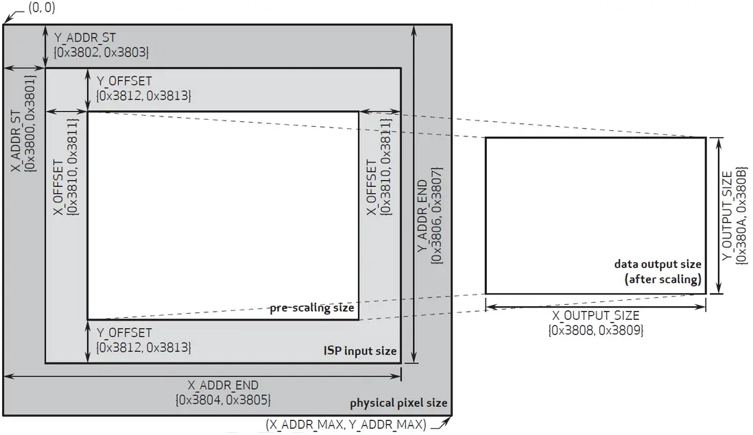 該設置允許用户設置整個傳感器區域(physical pixel size,26321951)的感興趣部分,也就是在傳感器裏面開窗(X_ADDR_ST、Y_ADDR_ST、X_ADDR_END和Y_ADDR_END),開窗範圍從00~2632*1951都可以設置,該窗口所設置的範圍,將輸入ISP進行處理。