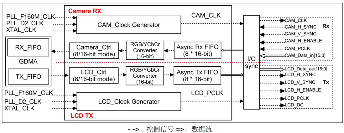 前面講解到,ESP32-S3的LCD_CAM控制器包含獨立的LCD模塊和Camera模塊。其中LCD模塊已經在第三十五章節中介紹過。下面我們介紹Camera模塊用於接收並行視頻數據信號,其總線支持DVP 8-/16-bit 模式。