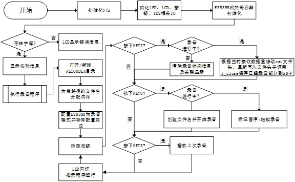 在錄音的時候按下KEY0則執行暫停/繼續錄音的切換,通過LED指示錄音暫停。通過按下KEY2,可以停止當前錄音,並保存錄音文件。在完成一次錄音文件保存之後,我們可以通過按KEY3按鍵,來實現播放這個錄音文件(即播放最近一次的錄音文件),實現試聽。