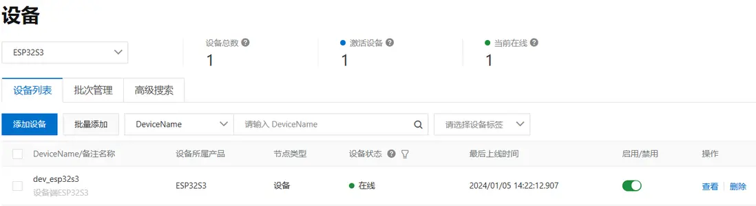 程序下載成功後,打開阿里雲平台的物聯網平台設備管理,可以看到此時的設備處於連接狀態,如下圖所示。