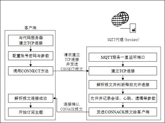 1,要在客户端與代理服務端建立一個TCP連接,建立連接的過程是由客户端主動發起的,代理服務一直是處於指定端口的監聽狀態,當監聽到有客户端要接入的時候,就會立刻去處理。客户端在發起連接請求時,攜帶客户端ID、賬號、密碼(無賬號密碼使用除外,正式項目不會允許這樣)、心跳間隔時間等數據。代理服務收到後檢查自己的連接權限配置中是否允許該賬號密碼連接,如果允許則建立會話標識並保存,綁定客户端ID與會話,並記錄心跳間隔時間(判斷是否掉線和啓動遺囑時用)和遺囑消息等,然後回發連接成功確認消息給客户端,客户端收到連接成功的確認消息後,進入下一步(通常是開始訂閲主題,如果不需要訂閲則跳過)。如下圖所示: