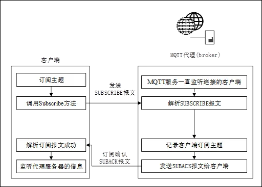 2,客户端將需要訂閲的主題經過SUBSCRIBE報文發送給代理服務,代理服務則將這個主題記錄到該客户端ID下(以後有這個主題發佈就會發送給該客户端),然後回覆確認消息SUBACK報文,客户端接到SUBACK報文後知道已經訂閲成功,則處於等待監聽代理服務推送的消息,也可以繼續訂閲其他主題或發佈主題,如下圖所示: