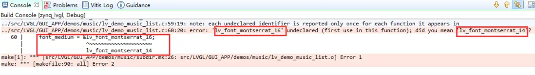 打開lv_conf.h文件,找到LV_USE_DEMO_MUSIC宏定義並設置為1,開啓該實驗,並且修改顏色深度配置LV_COLOR_DEPTH宏定義為32,編譯工程,若出現下圖所示報錯,這説明14號以及16號字體沒有定義。